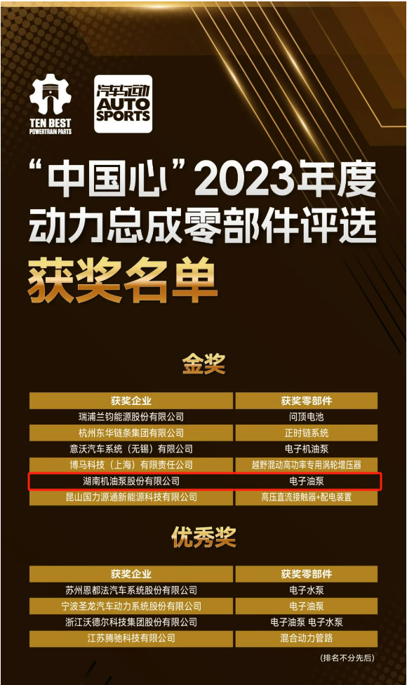 2023年11月8日 ,“中國心”2023年度動力總成零部件評選公布,湖南機油泵股份有限公司研發的電子油泵作為動力總成潤滑系統的“心臟”,榮獲了業界具影響力的金獎。這一殊榮不僅是對湖南機油泵不懈追求卓越品質和技術領先地位的認可,也標志著公司在全球動力總成領域的領跑者地位。
